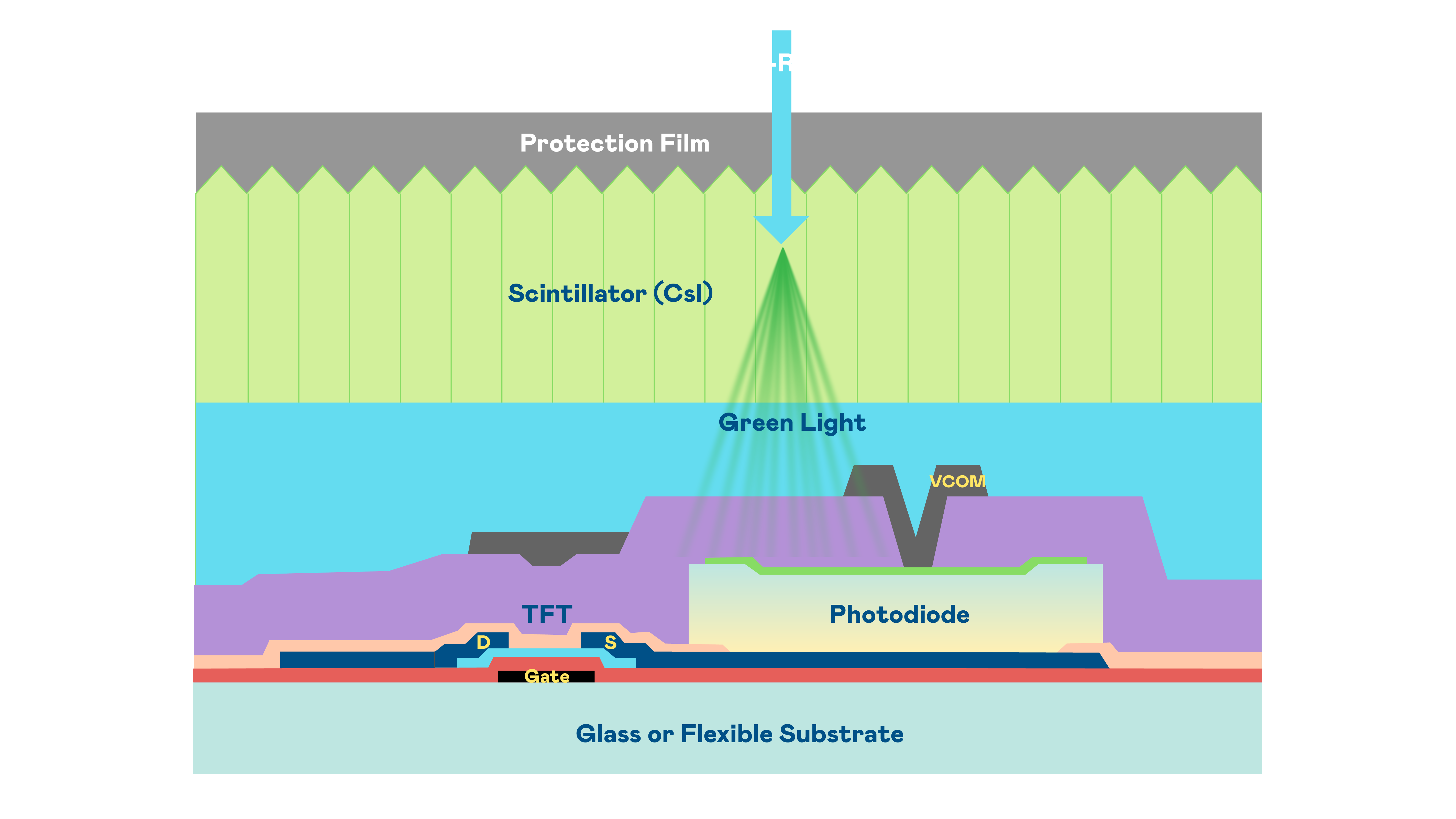 MG不朽情缘的X光影像感测阵列使用薄膜电晶体 (TFT) 作为每个像素的读取开关,搭配光电二极体(Photodiode)的光电转换元件,用以感测X光影像讯号。